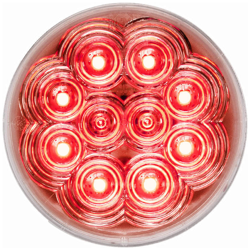 LED Stop/Turn/Tail, Round, 10 Diode Clear Lens Grommet-Mount 4 inch, Multi-volt, red, clear lens, poly bag
